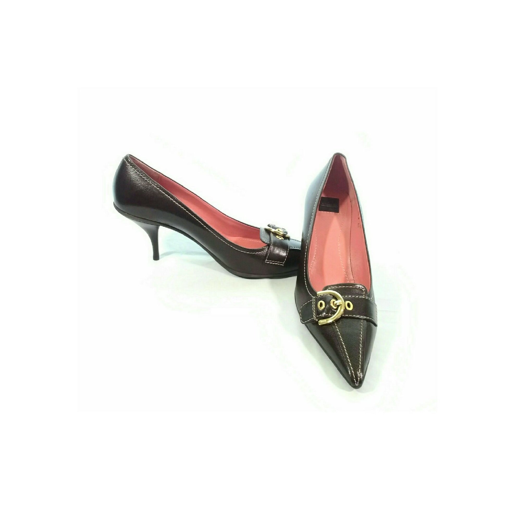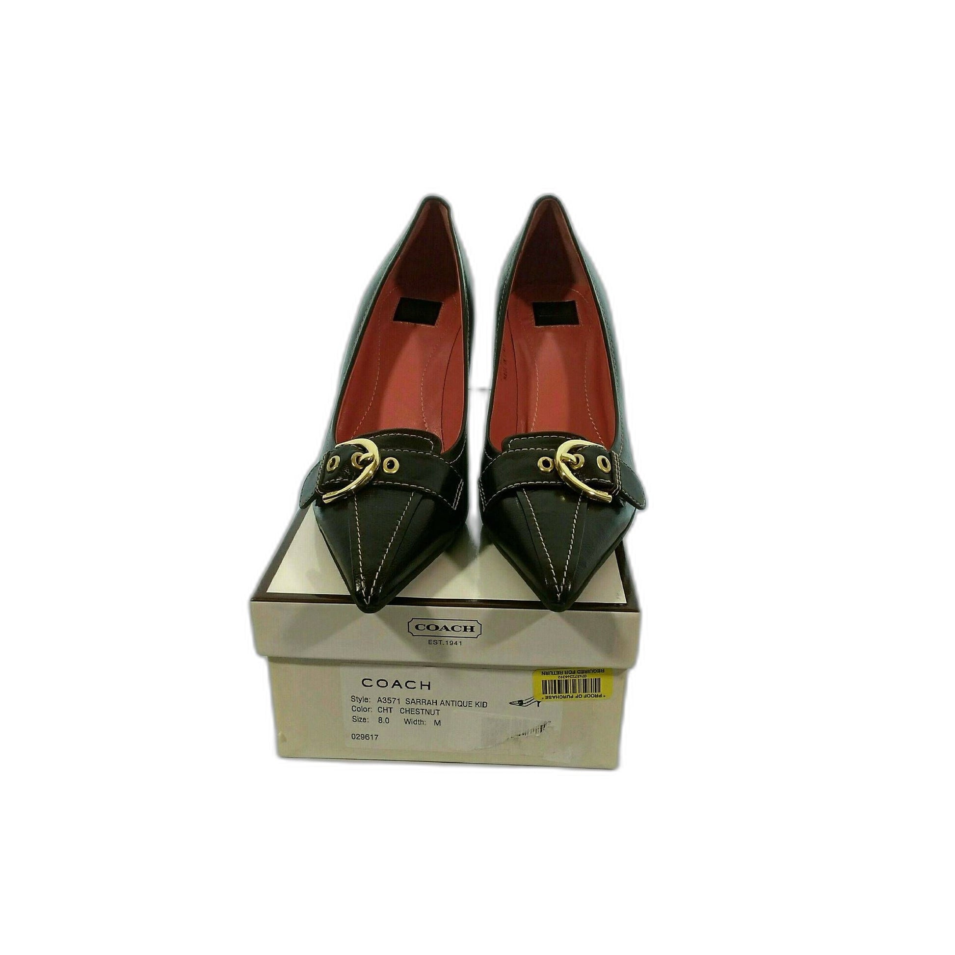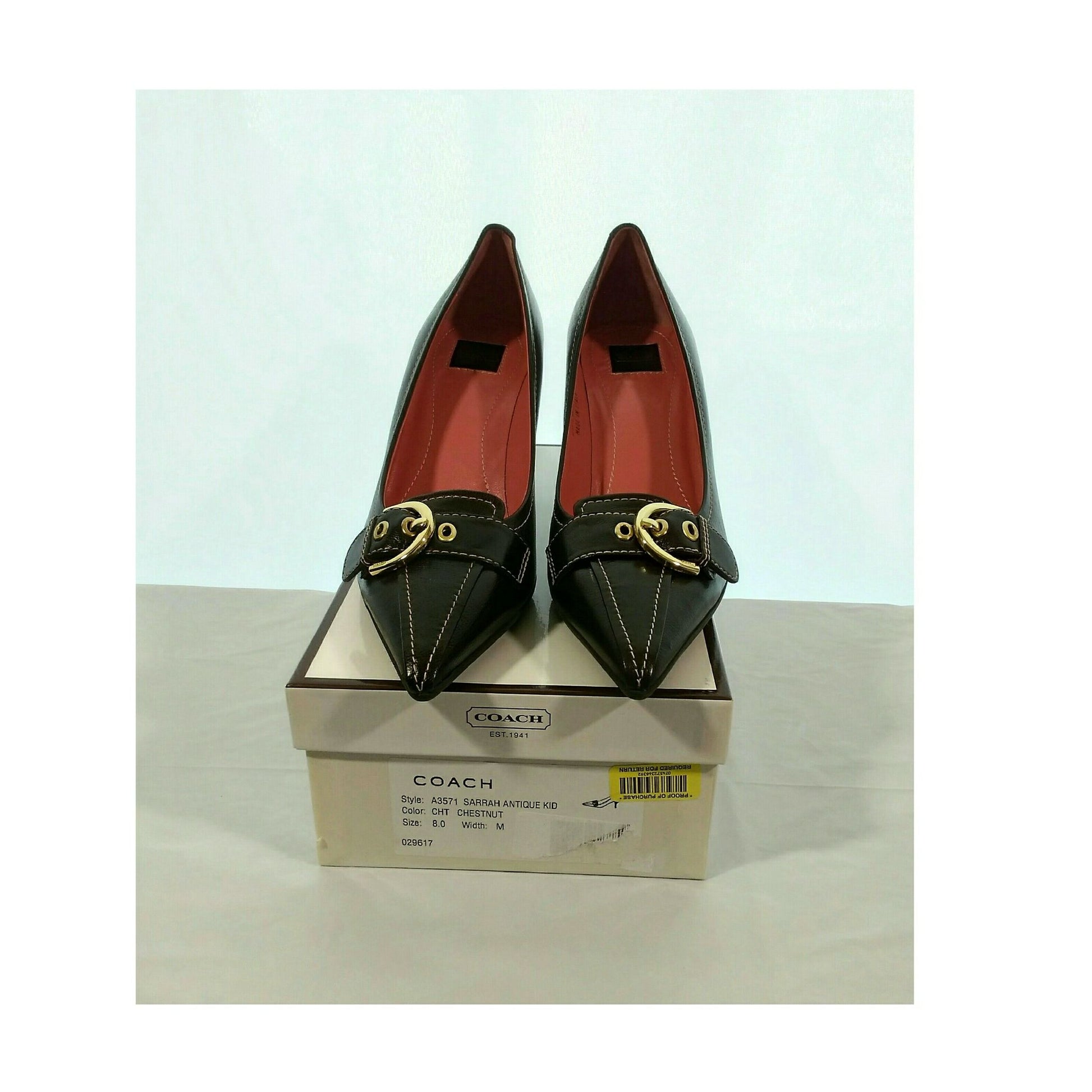 Color Chestnut Leather pointed toe pumps, top stitching and with coach gold/brass buckle detail. New in Original box, box in very good condition, shoes never worn. Not vintage- produced between 2010-2019.