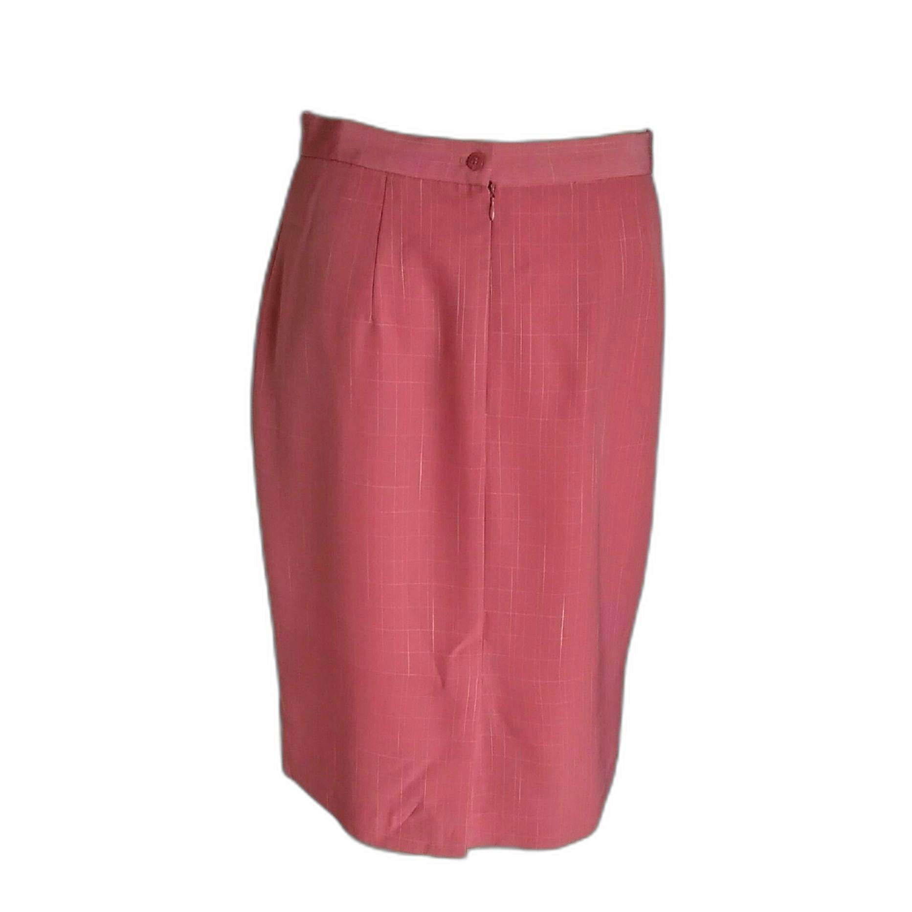 The skirt, described in the measurement section, features a waistband with a 7" zipper and a single button closure.
