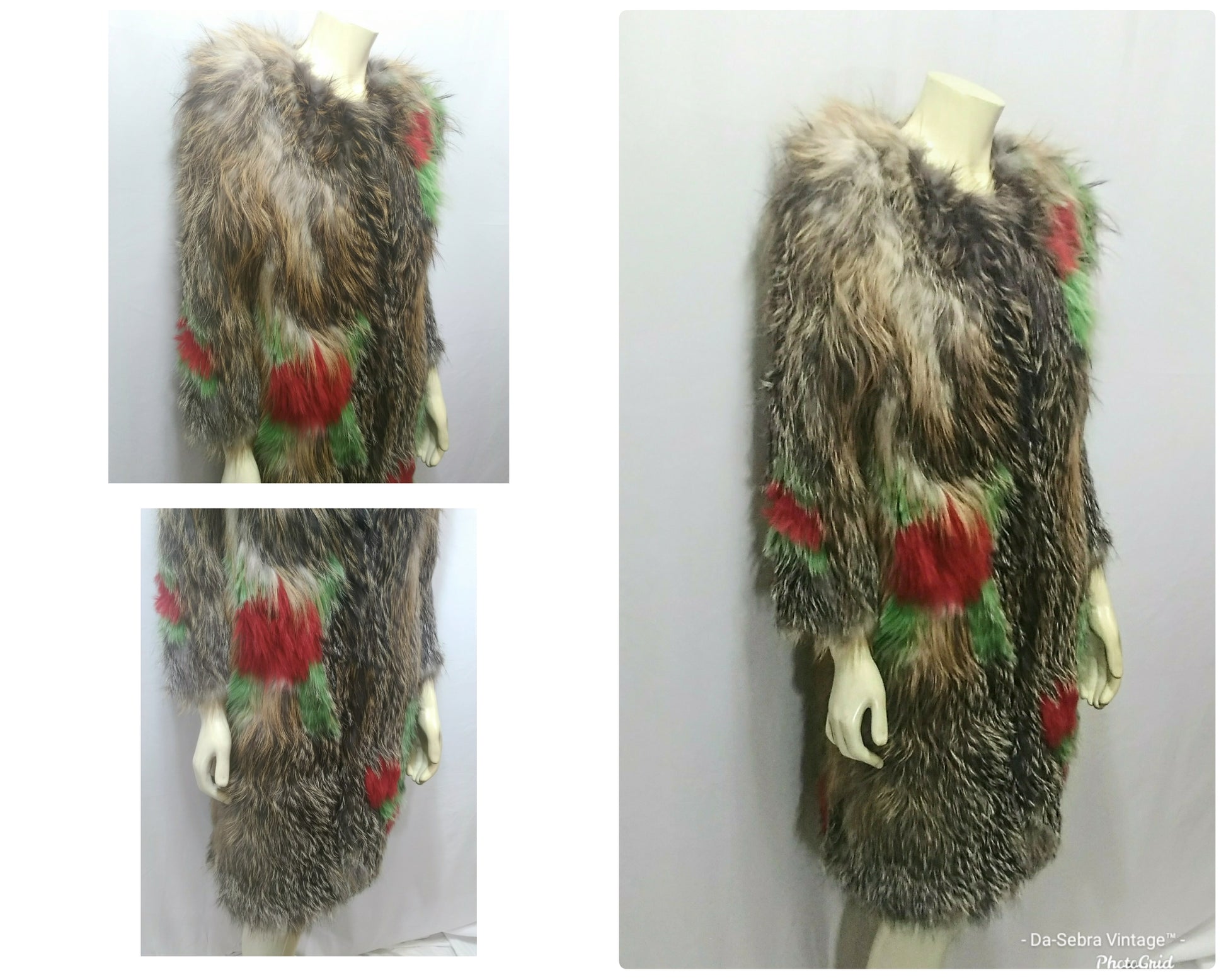 Experience the ultimate in soft and plush warmth with this genuine woven fox fur coat. Designed with stylish pops of red and green fur, this modern piece (estimated production 2015-2020) adds a touch of luxury and individuality to your wardrobe.