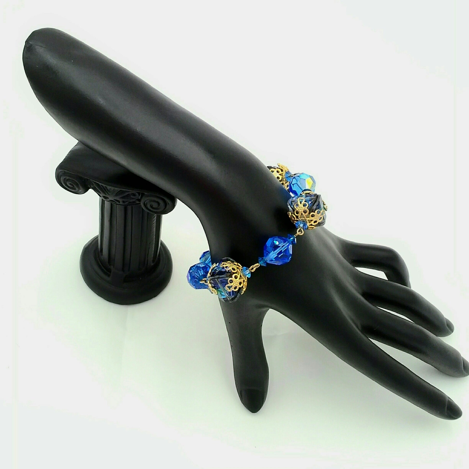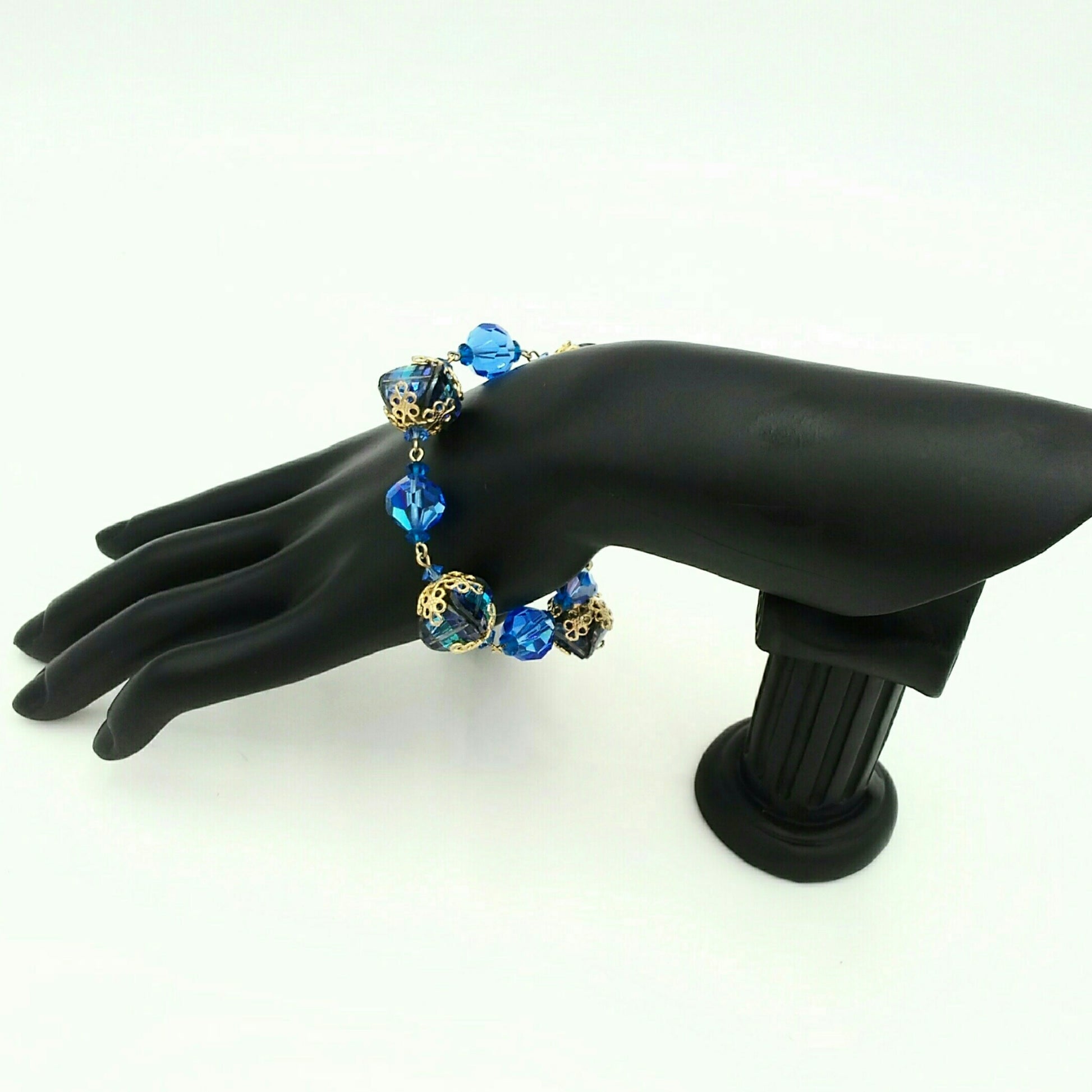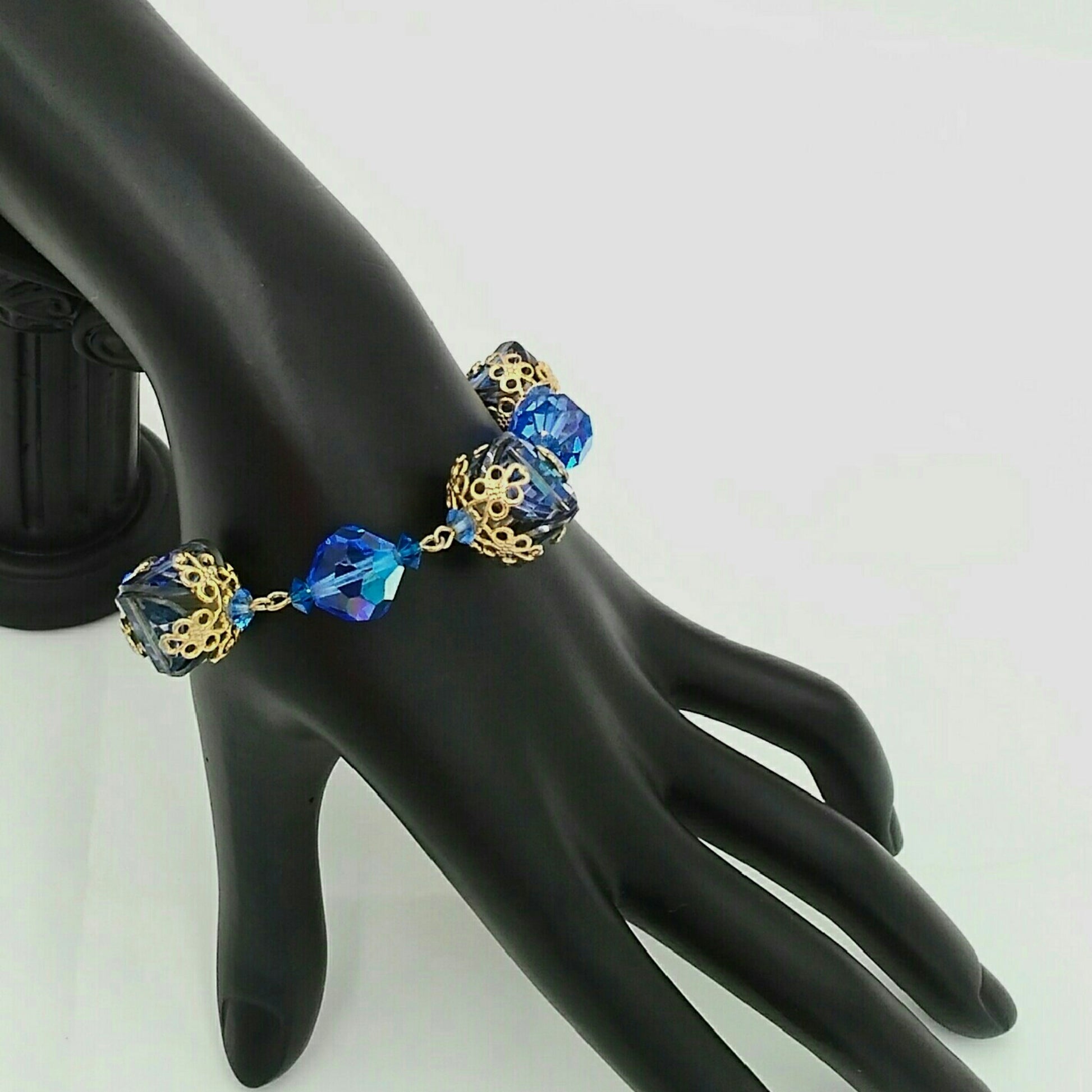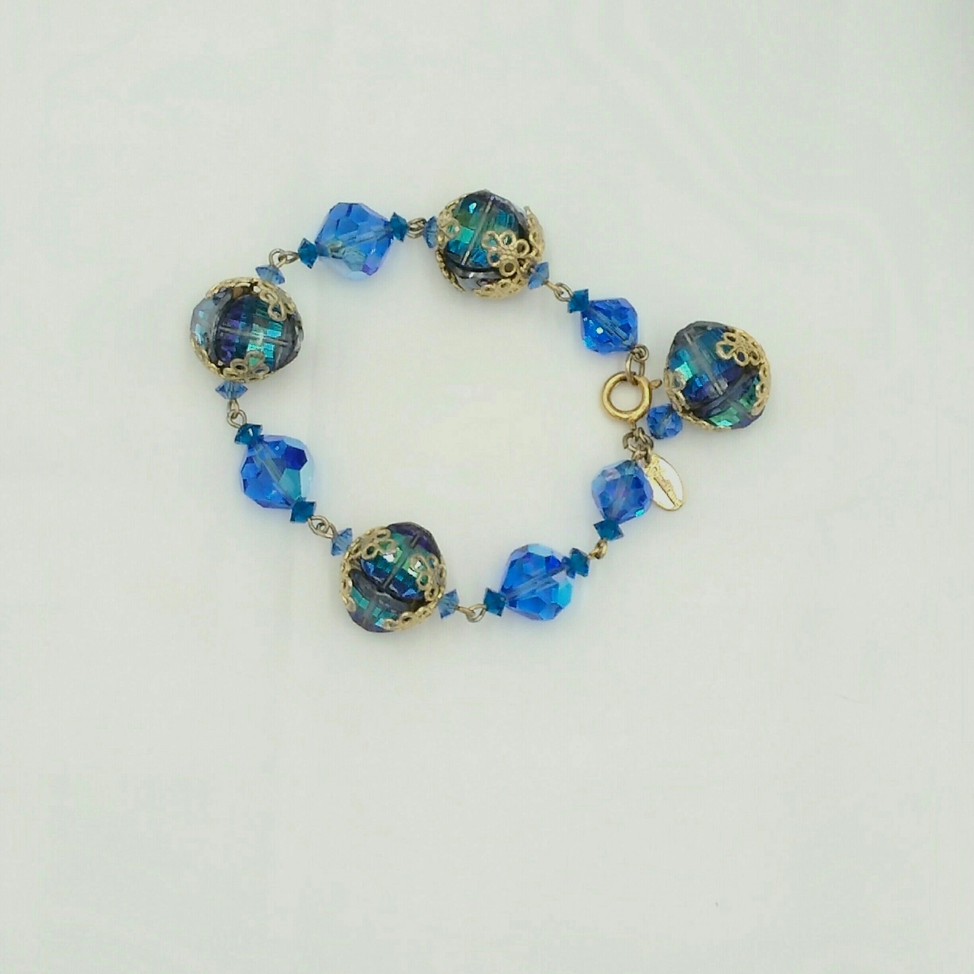 Vintage late 1950s / early 1960s; Signed Vendome Bracelet. This beautiful Iridescent blue Swarovski crystal pagoda bead bracelet is surrounded with a gold tone filigree setting. The larger beads are cut in half and the ornate design of the filigree setting holds the beads together, which adds that exquisite sparkle. Great piece to add to your collection or perfect gift for a bride to be--something borrowed, something blue. Very Good Vintage.