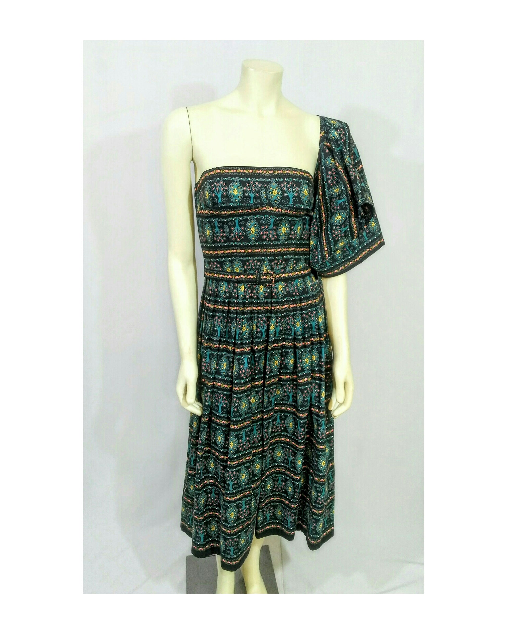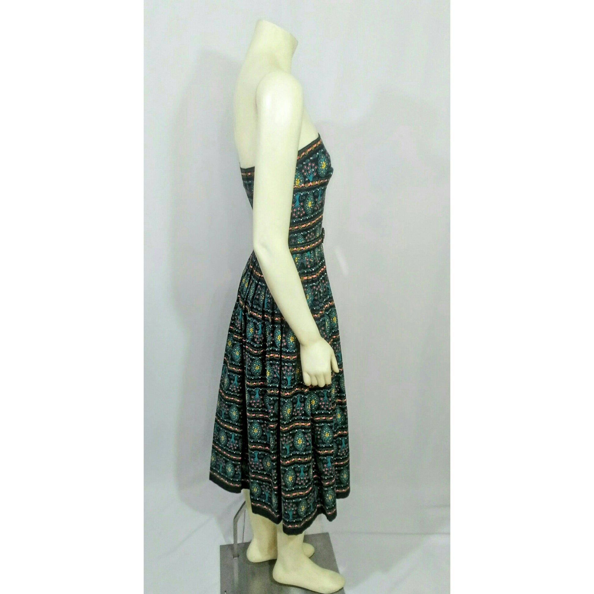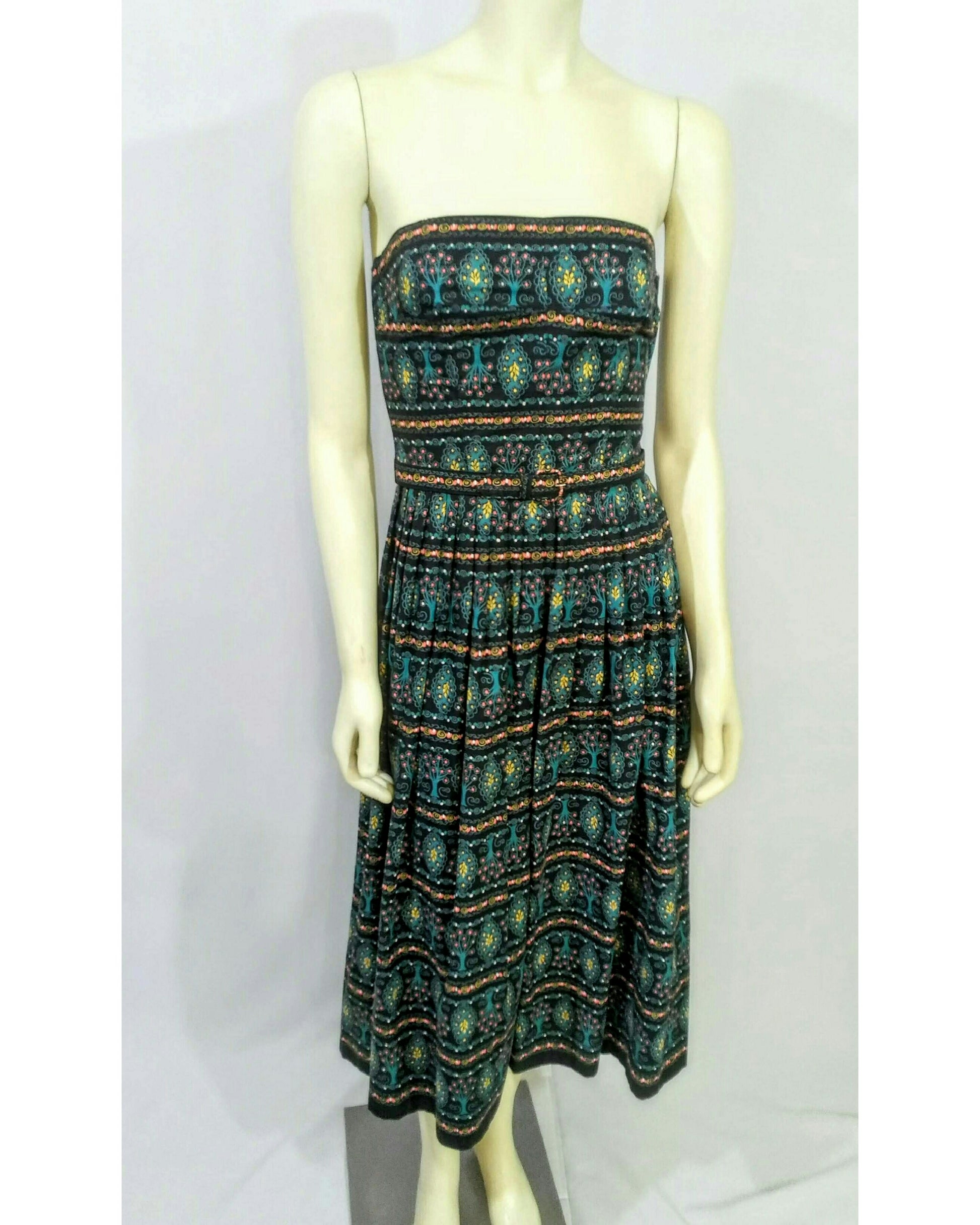 Step into the charm of the 1950s with this stunning summer Curated Strapless Dress featuring an enchanting Tree pattern design. This vintage gem comes complete with a Matching Shrug and Belt, adding a touch of timeless elegance to your wardrobe. Crafted from a delightful cotton blend, it showcases vibrant Teal, Yellow, White, Orange, and Black hues. While the designer's tag has been lost to time, the beauty of this piece speaks for itself.