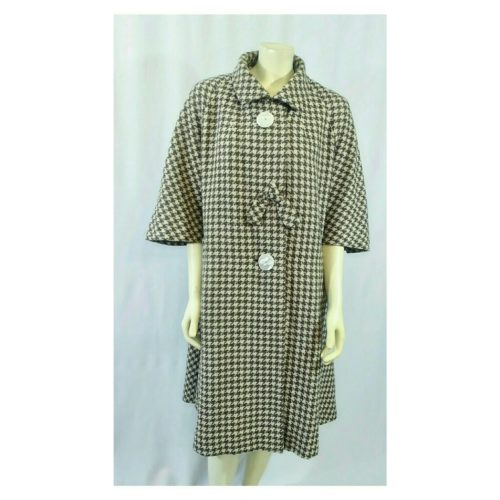 Vintage 1950's Swing Coat; Wool Tweed, Tan and Beige Checkered with oversize 1 3/4" Mother of Pearl buttons in front, with a faux bow in middle with a snap fastener underneath. Coat has a 2 1/2" width collar with small button underneath with a loop fastener and 3/4 " sleeves. Coat is fully lined in orange polyester, no discoloration, tears, or snags. No label of size, designer, manufacturer, or contents of fabric attached. Gorgeous and Mint Condition. If you need additional photographs, I will be more than happy to supply.