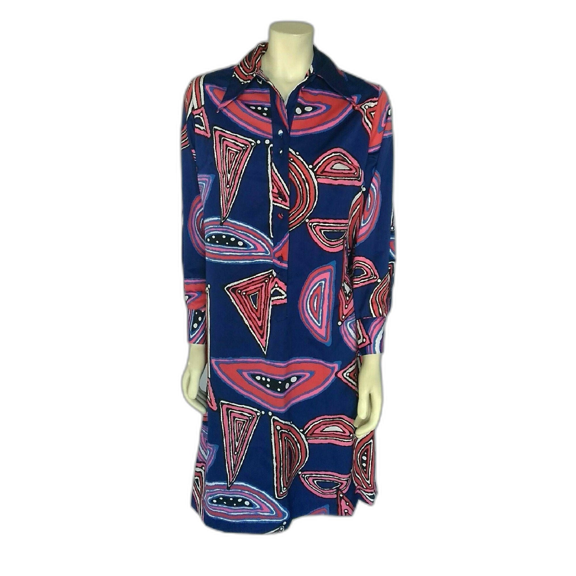 Experience the captivating allure of the 1960’s with this vintage Lanvin abstract geometric print shirtwaist dress. A masterpiece of design, the shift-style dress boasts a vibrant color palette featuring navy, red, pink, white, and light blue hues. The shirt collar adds a touch of sophistication, while fabric-covered buttons grace the bodice and sleeve cuffs – six on the bodice and two on each cuff.