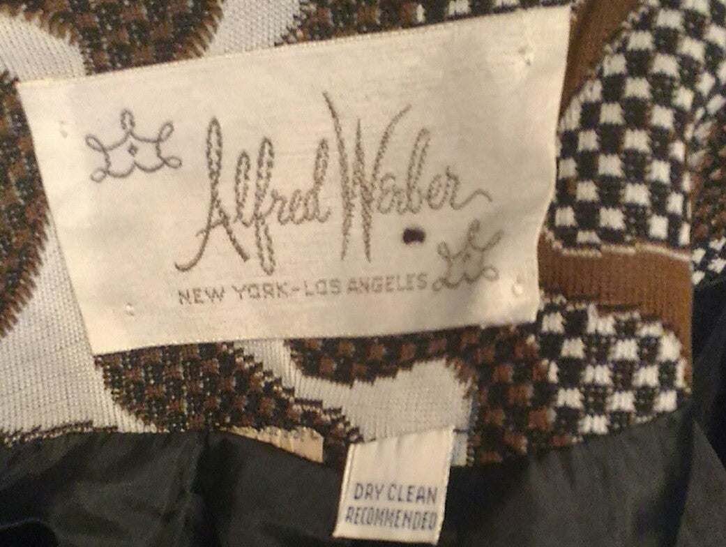 Vintage 1960's Designer Alfred Werber. This coat is to die for! The geometric print in colors of Beige, Black, Rust, Brown, and White are a beautiful, dramatic and eye catching. The over size collar shape from behind looks like a Cape Collar. The collar has the versatility to shape into a variety of different way. The coat is button less has two strings on the inside to close. The other side of coat just lays flat (like a wrap). The trim of coat is a heavy cotton yarn. The coat inside and out, is in Mint Condition! No holes, tears, rips, stains or discoloration. I would be more than happy to provide additional pictures upon request.