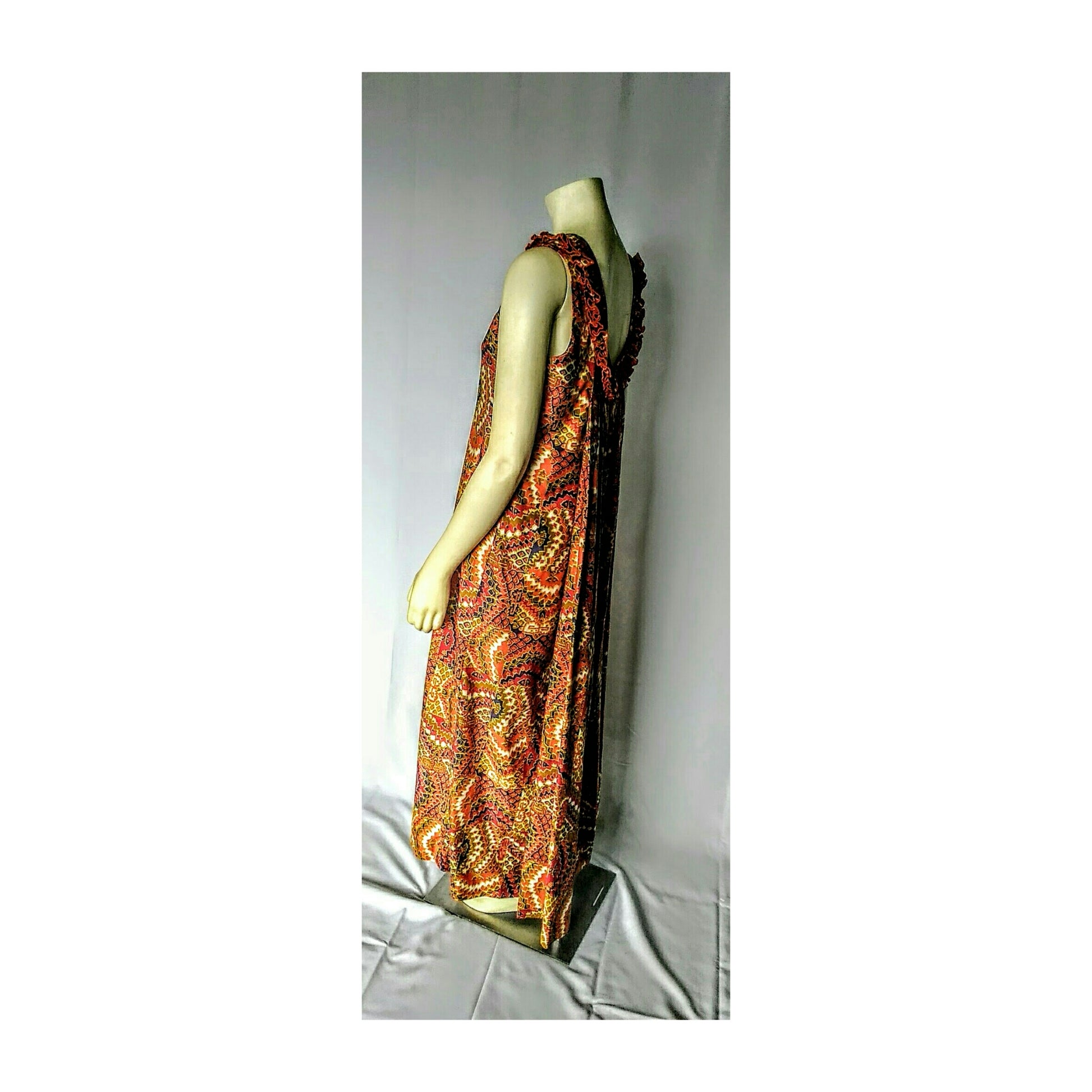 Step into the iconic style of the 1960's with this captivating multi-color maxi dress from Rhapsody by Glazier. A true masterpiece of its time, this sleeveless abstract dress features a vibrant array of colors including orange, white, olive green, lime green, red, and purple. The ruffle front neckline gracefully flows into a V-back design with a pleated back drape, adorned with a 15" metal zipper.
