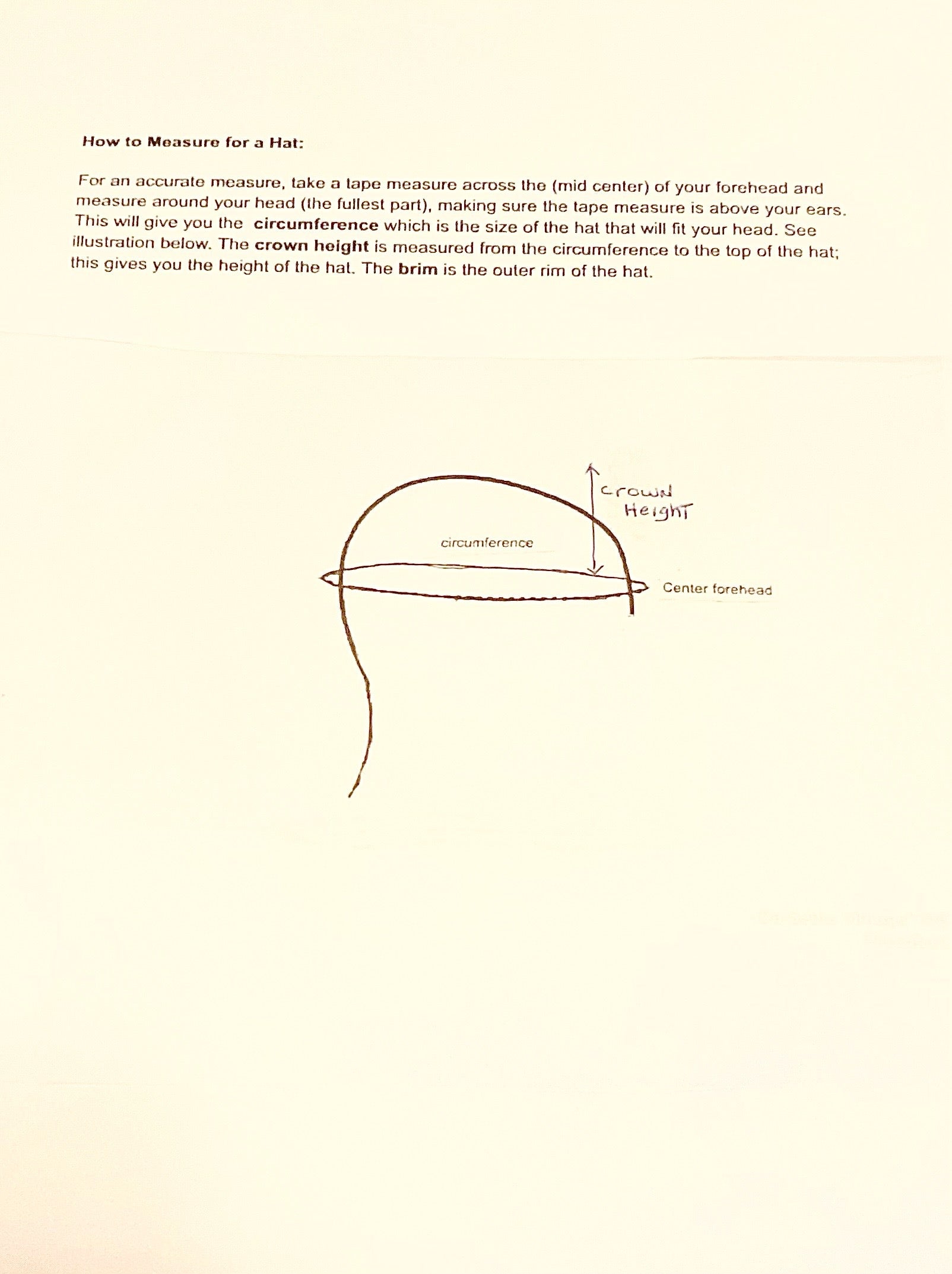 Measurements of hat: Circumference of hat 22", Brim width is 1", Hat crown 5", Interior hat band 1/4" wide. See how to measure for hat diagram.