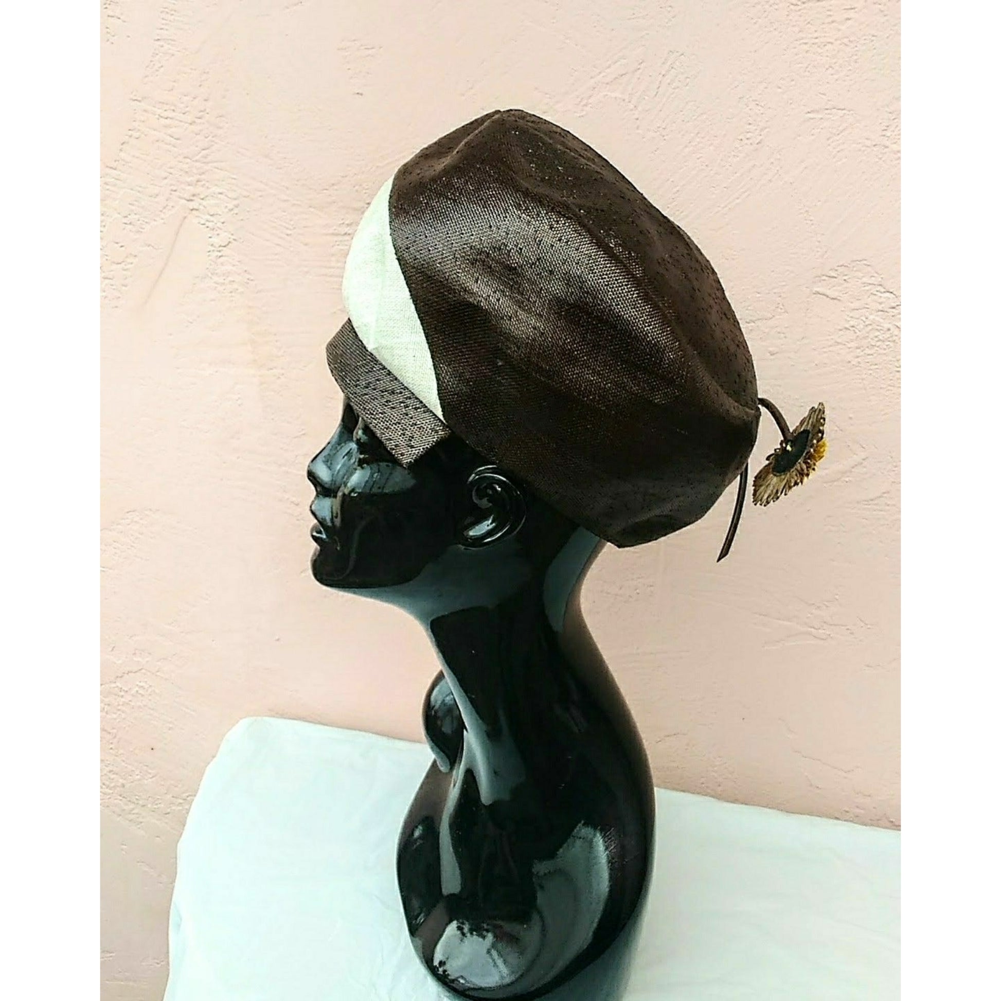 The hat's unique silhouette blends the era's popular apple hat design with a more pronounced, taller crown. Adding a touch of whimsy is a decorative straw daisy with a stem at the back. The hat showcases a classic beige and dark brown color combination and features a luxurious silk dupioni lining. Presented in excellent vintage condition, with no flaws such as holes, tears, or discoloration.