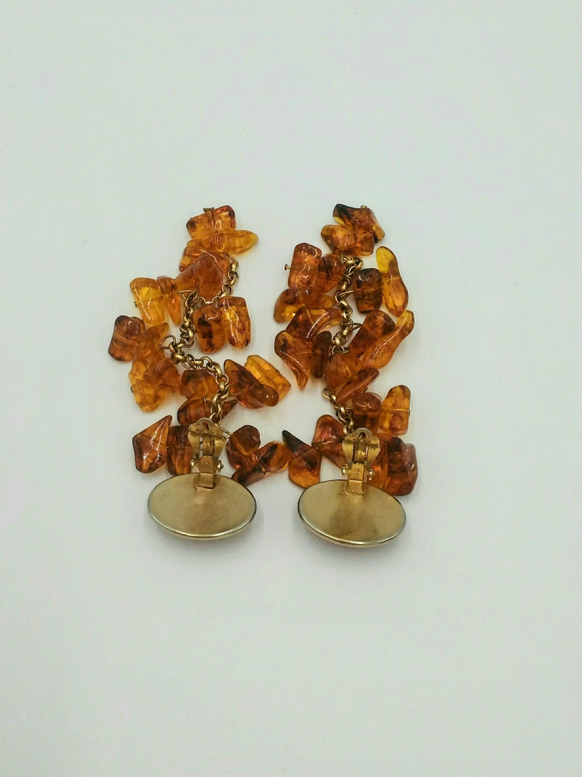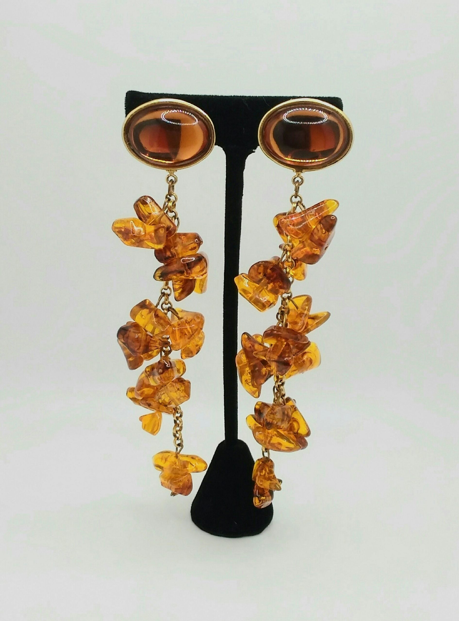 Vintage 1980s Amber color Lucite dangle earrings, by designer Amy Jo. Absolutely gorgeous, as the Lucite resembles the look of honey dripping down the gold plated chain. This was definitely ah high fashion look for the 80s. Clasp on back functions properly. Jewelry is signed Amy Jo, New York. Condition-Very Good Vintage, no cracks or chips.