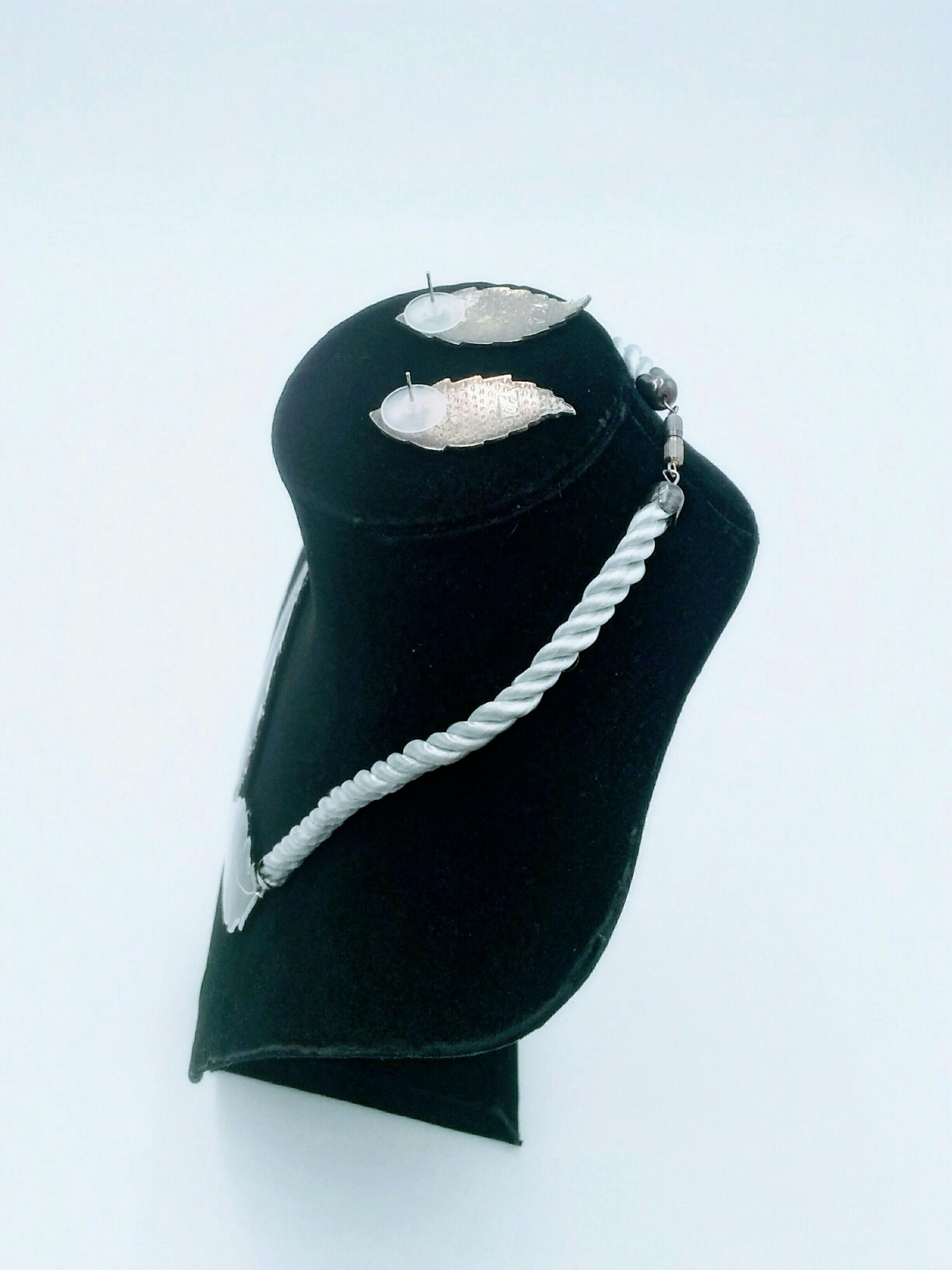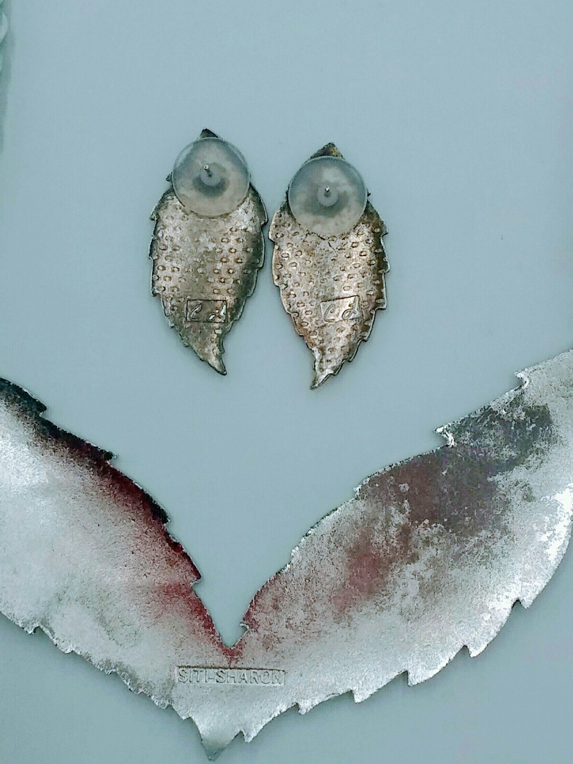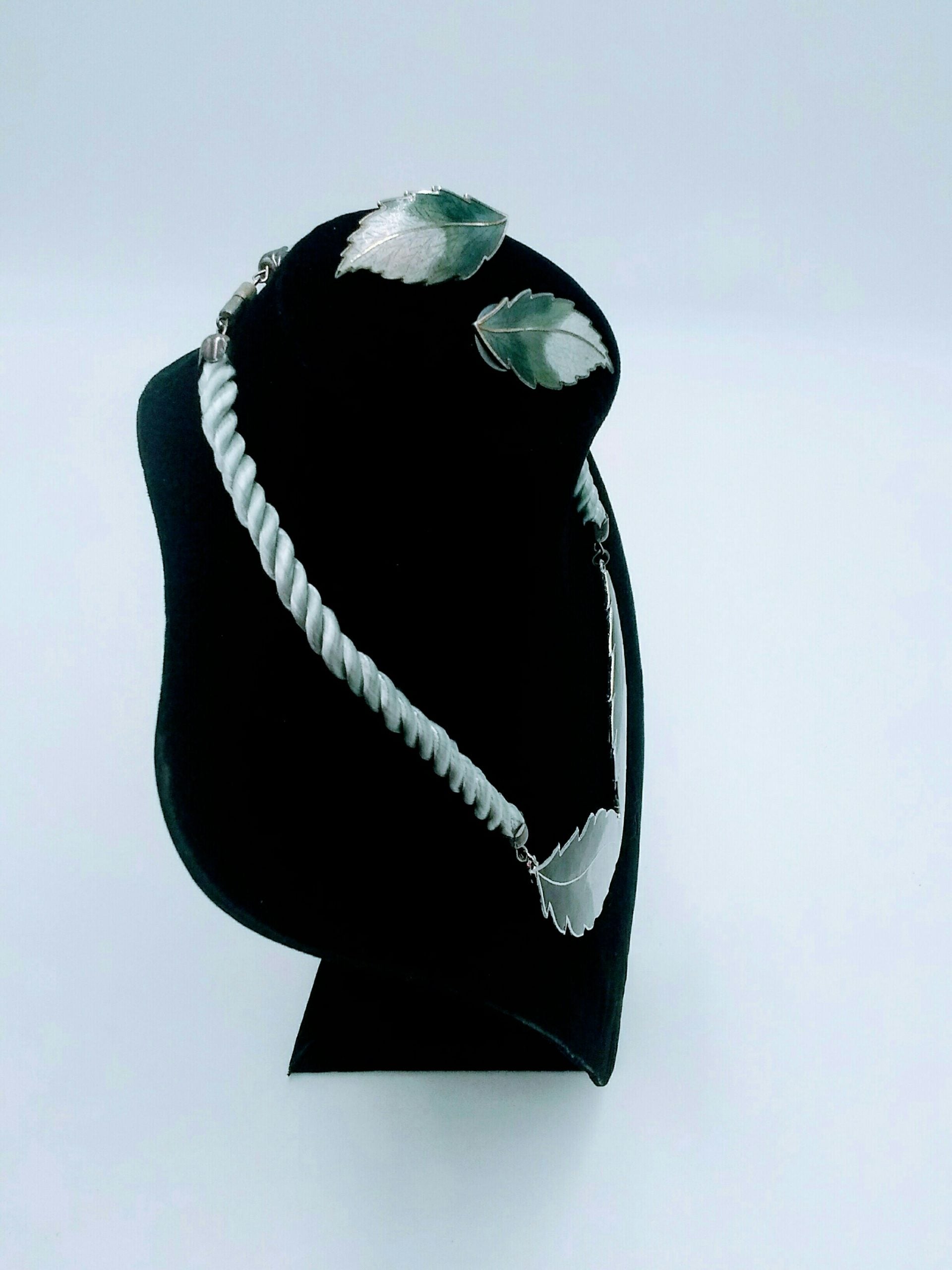 Vintage 1980s Signed Siti-Sharon. Gorgeous Guilloche Ombre Enamel Double Leaf Necklace and Earrings. The Ombre on both necklace and earrings are in three beautiful colors; from Silverish-Gray, to Silver-light Green, into a Silver-Darker Green. The leaf design on both necklace and earrings has a silver line design etched down the center of the leaf. The bold double leaf is affixed to a grayish/silver-silk thick cording, cording is beautiful, and still has all the the luster. The closure of clasp is a screw barrel. The same leaf design and Ombre color are found on the pierced earrings. The earrings having a marking of CL, the CL is a known mark and means an item is silver clad or silver plated and not pure silver throughout. The earring backing/pierce is in excellent condition. The back of the necklace is marked “Siti-Sharon”. Both pieces are Excellent Vintage Condition.