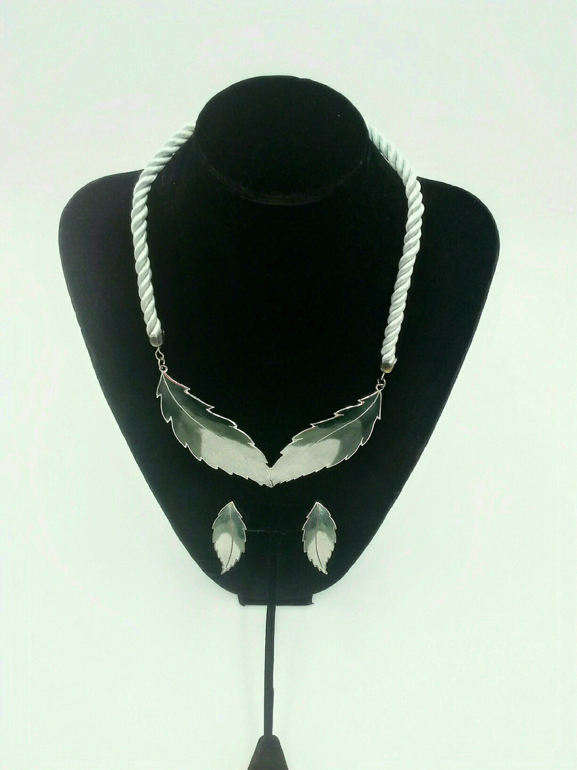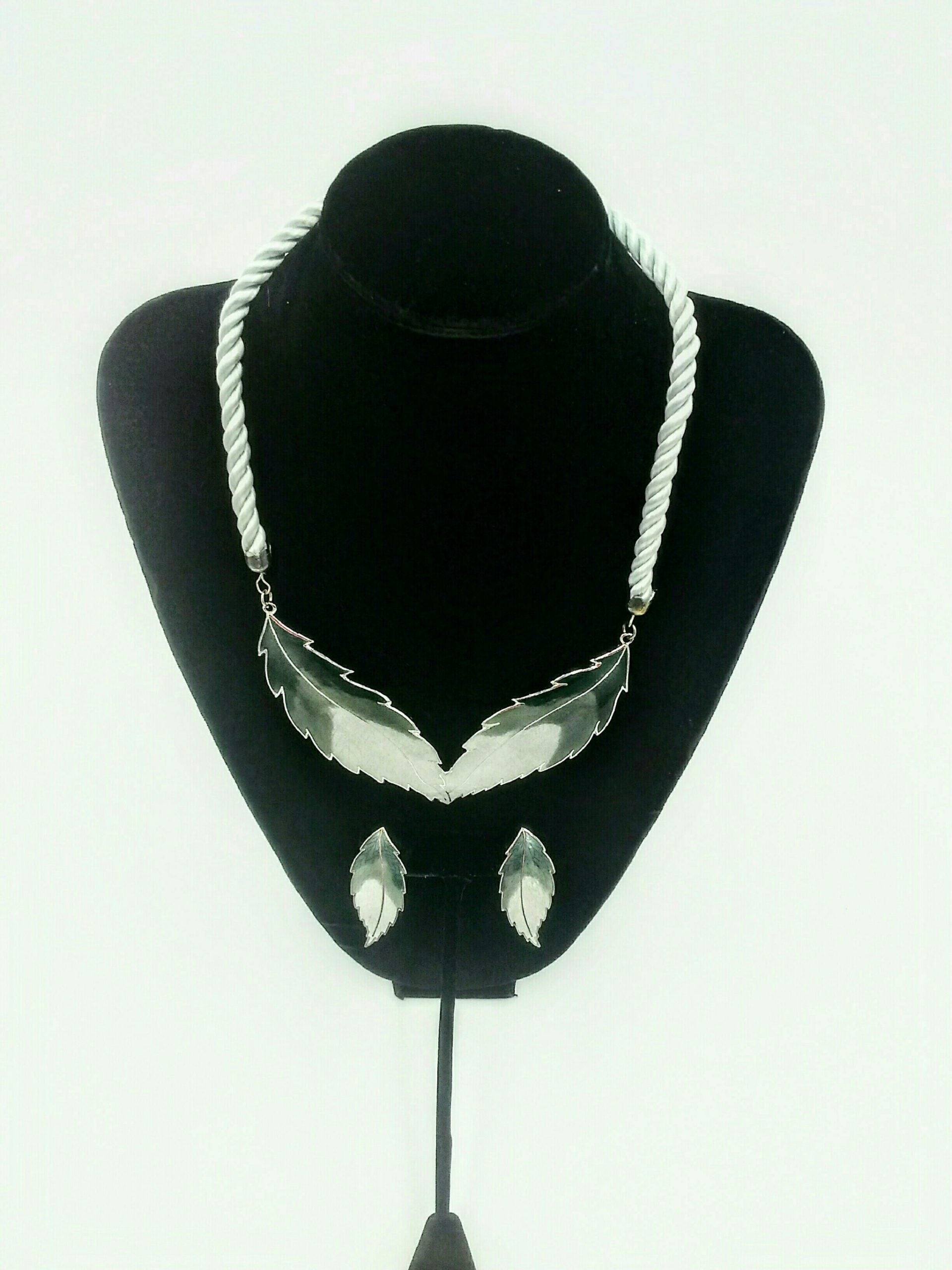 The measurements are as followed: Necklace; Length 17 1/2" (end to end); Top Leaf to Top Leaf 4 1/2" wide, Leaf Width 1 1/16", Leaf Length 3 3/8". Earrings; Length 1 1/2", Width 5/8"