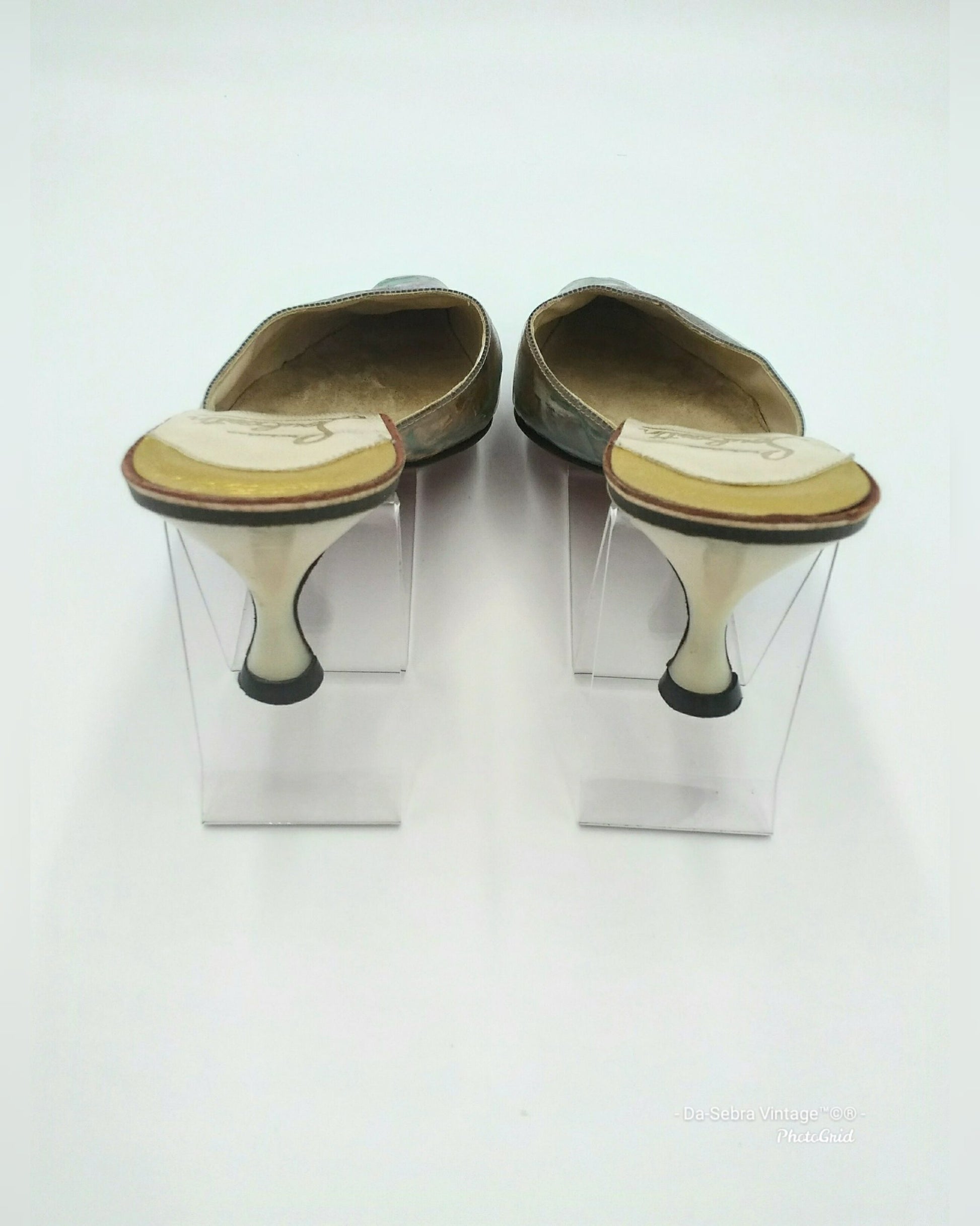 Vintage 1990’s Authenticated Rare Trash Mules by Christian Louboutin. Size: 36 /Size US 6. The shoes were produced in limited quantities. The front of each shoe has a collage design, each one different, and contains scrapes of fabric, threads, feathers, gold and silver foil. To top the shoe off, it was covered with a clear plastic. The inside of the shoe at the base is suede with leather. The kitten heel height is 1.5" that sits on that famous red bottom. Excellent Vintage Condition. If you would like to view additional pictures, I would be happy to provide on request.