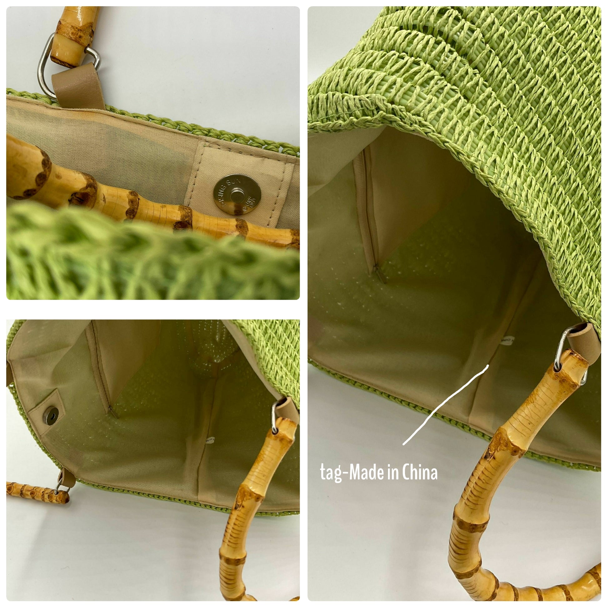 Step back into the fabulous 80s with this eye-catching lime green straw bag. This vintage piece exudes resort elegance, though its exact origin remains a delightful mystery from the seller's extensive travels. Adding to its charm, the front of the bag features two beautifully woven palm trees with a subtle touch of red amongst the darker green leaves. The bag's design also includes layer's of individual coated plastic strips (inside) intricately woven into the raffia straw, providing added structure and durability. Inside, you'll find a soft beige muslin lining with a convenient small zipper pocket for your essentials. It closes securely with a magnetic lock. Adding a touch of natural flair, the bag boasts sturdy bamboo handles accented with a metal insert attaching them to leather pieces affixed to the bag. A truly unique and stylish find! Excellent Vintage condition.