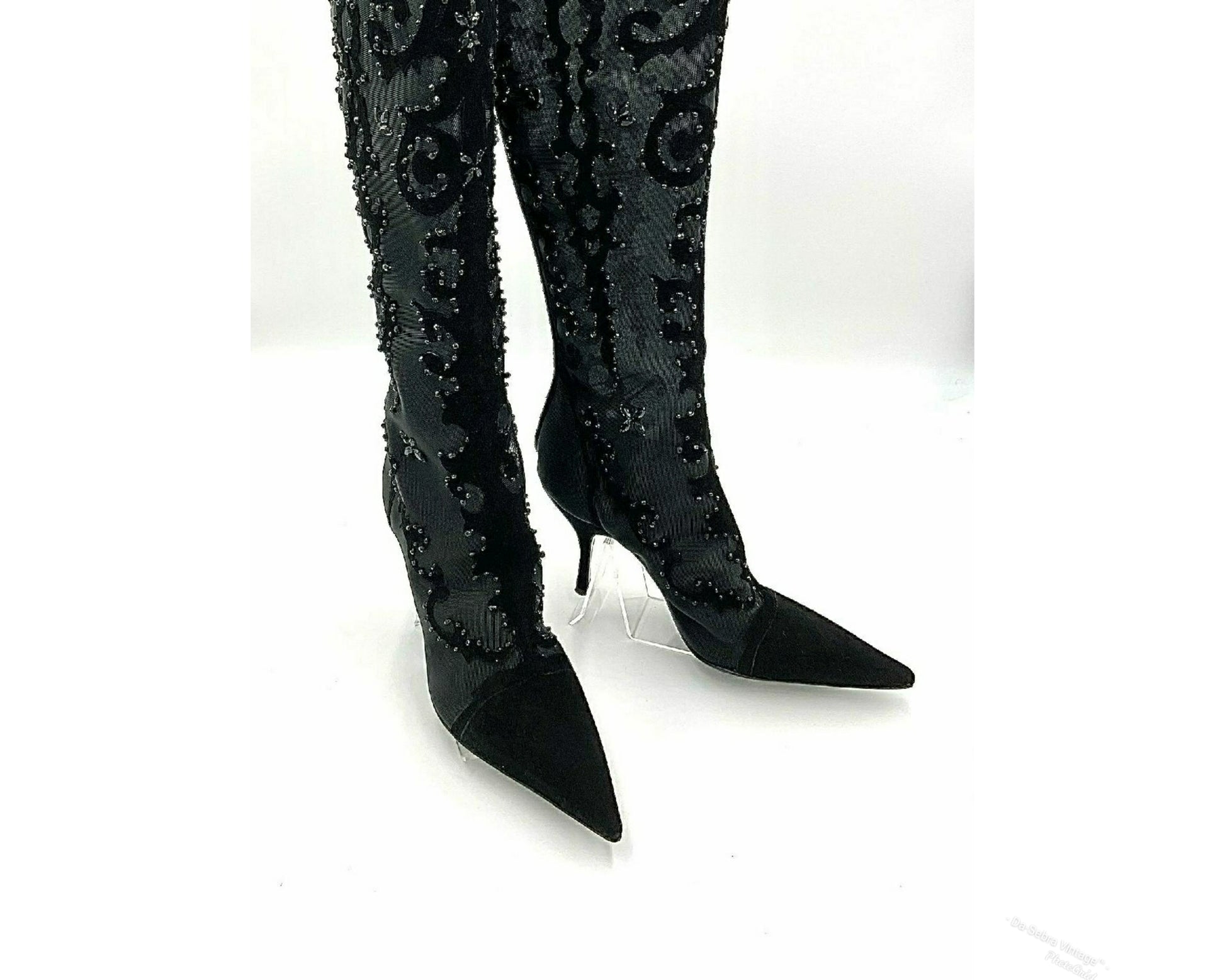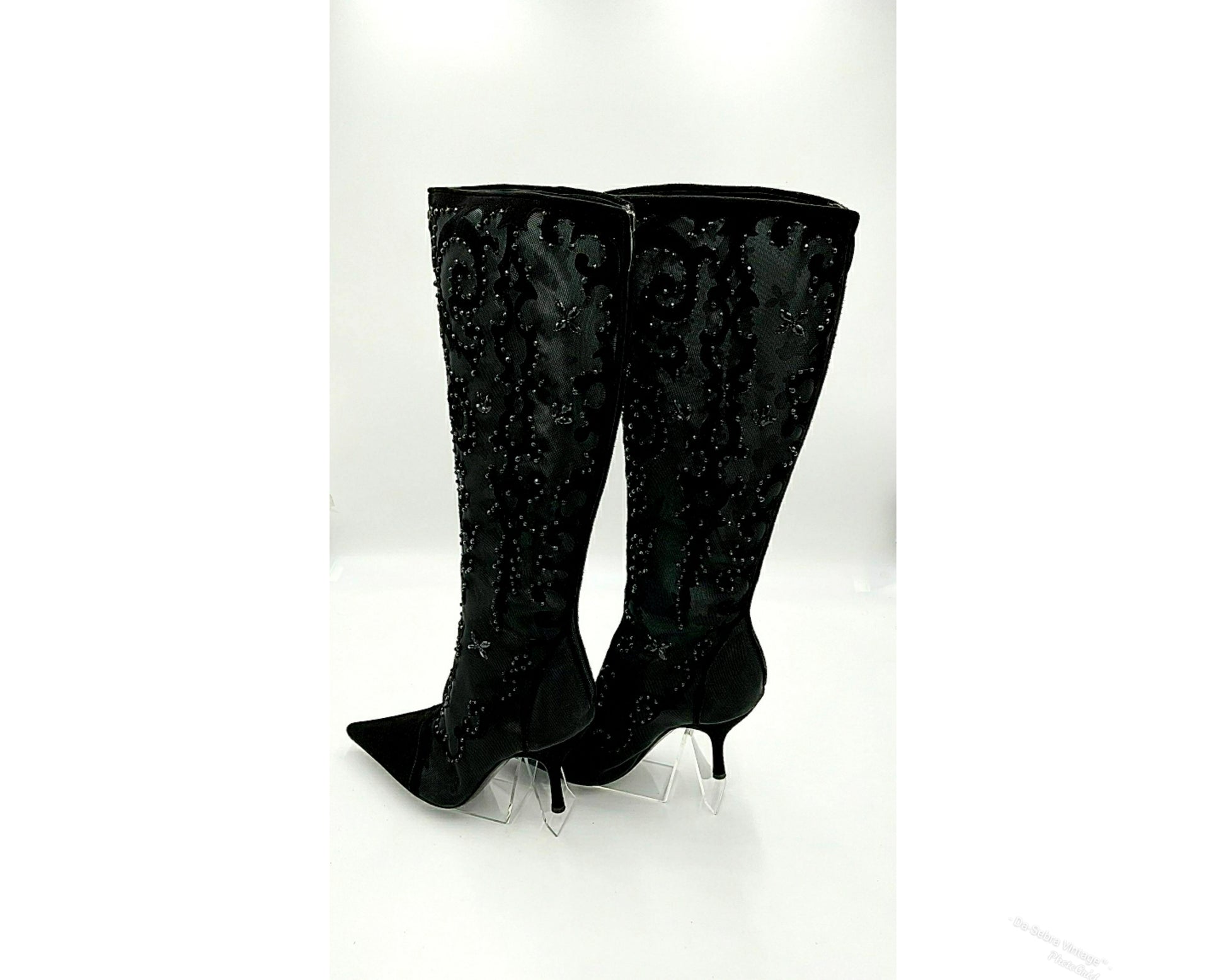 Exquisite Y2K Sergio Rossi Black Suede & Crystal Mesh Knee High Boots