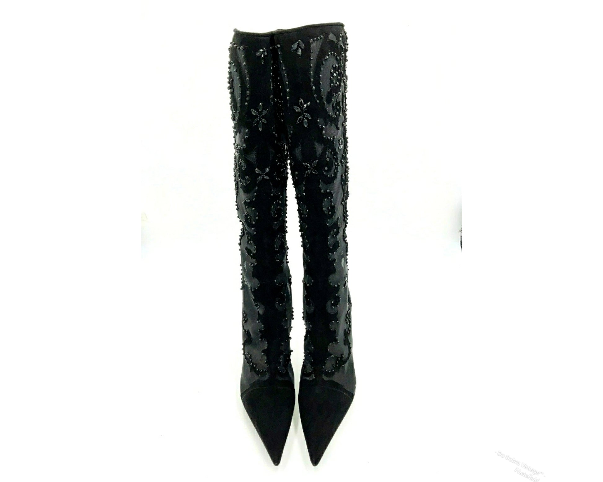 Y2K Sergio Rossi Crystal Embellished Black Suede & Crystal Mesh Knee High Boots
